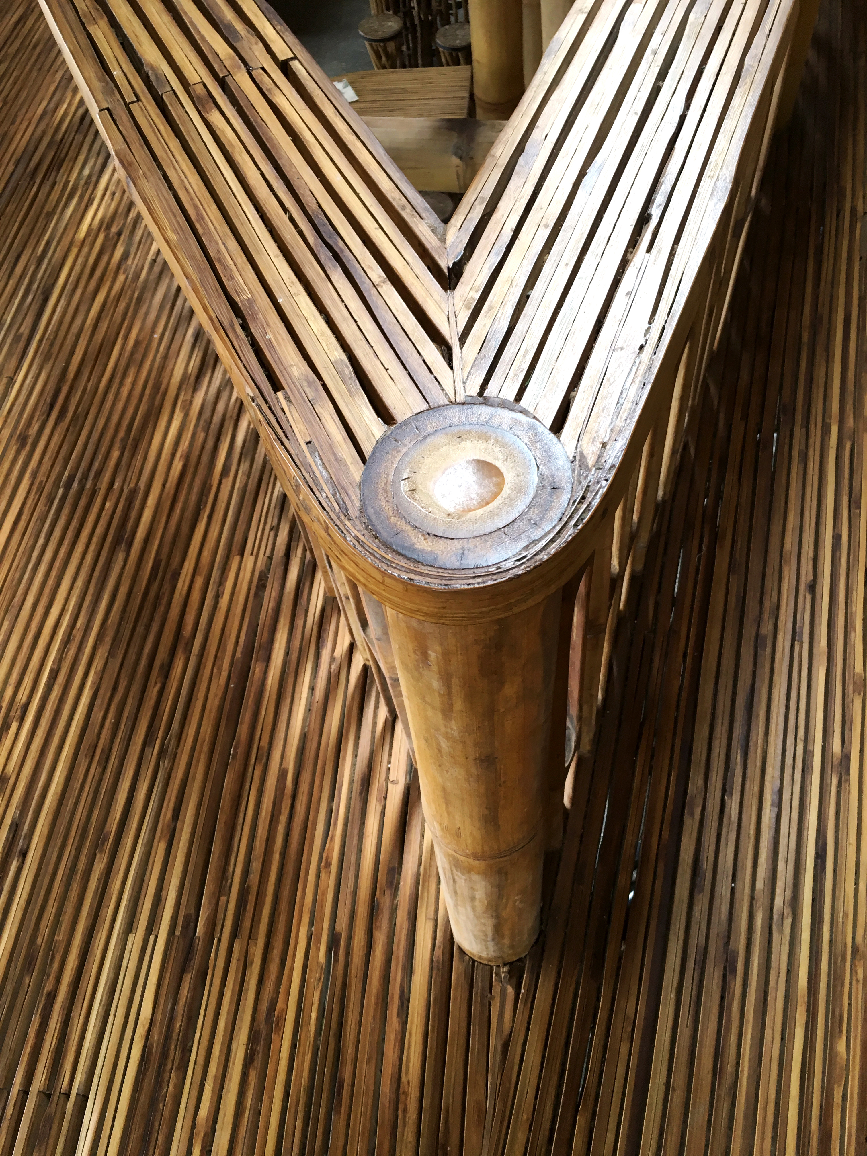 Above the polished terrazzo cement floor, the whole construction of the building is made out of bamboo. Only the closed rooms at the ground floor are built out of brick walls and clay plaster.